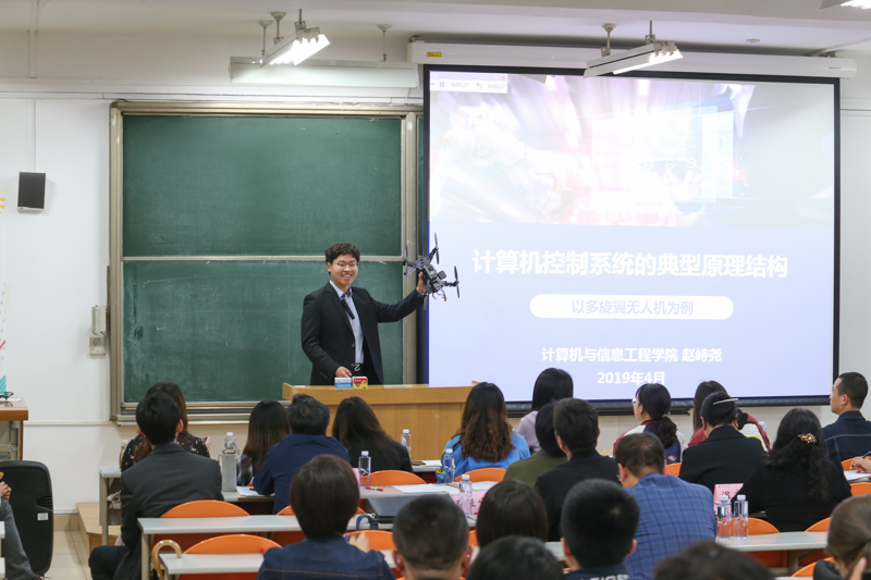 決賽現場,每位參賽選手都通過20分鐘的課堂教學演示,展現了自己扎實的教學基本功和新穎的課堂安排。文科組來自商學院的仇勇老師,從大家關注的“五一假期”導入,為在場聽眾講解了法定假期與加班工資的測算,語言風趣幽默,富有親和力。文科組來自藝術與傳媒學院的鄧瑩潔老師,通過形象生動的教學展示和設計獨特的現場互動,為“外國留學生”講解了漢語的語法與用法。理工科組來自計算機與信息工程學院的趙峙堯老師,在輕松風趣的語言和燦爛的笑容中,運用多旋翼無人機實體道具,為大家生動形象地介紹了計算機控制系統的典型原理結構。理工科組來自計算機與信息工程學院的孫茜老師,通過電梯和機床臺的視頻引入主題,為在場聽眾講解了三相異步電動機正反轉控制電路的原理,課件精美,舉例恰當。
