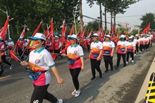 早上6點鐘,所有志愿者到位,在指定點位站定,集結方陣、分阻人流,維持會場秩序。上午8點半,長走大會正式啟動。8名旗手志愿者帶領參與者們有序向前行進;負責方陣集結的志愿者們,伴隨著激昂的口令聲,帶領“愛國先鋒”方陣大步向前走去。沿途,志愿者們站成兩列,一起搖動著手中的紅旗,為參與者們加油助威。在終點認證處,志愿者們在烈日下累計運送米袋130包、往返14次。認證志愿者們耐心引導所有長走參與者進入終點認證區,做好最后的認證工作,認真地為參與者們兌換紀念品。盡管烈日當頭,但志愿者們始終保持著良好的精神狀態,全身心投入到志愿服務中,以得體的舉止、甜美的微笑、優質的服務得到了工作人員與參與者們的一致認可。