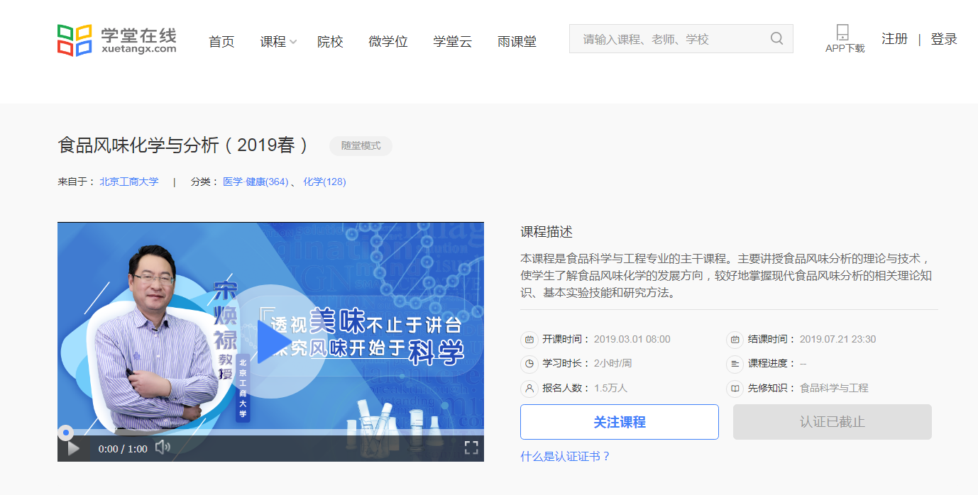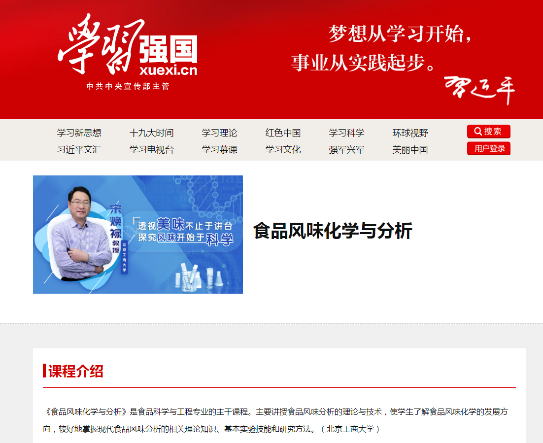 7月31日,我校慕課課程《食品風味化學與分析》成功入選“學習強國”平臺“學習慕課”欄目,以供全國九千多萬黨員和廣大社會群眾在線學習。該課程由我校研究生院立項建設,食品與健康學院宋煥祿教授團隊設計開發,供研究生和本科生及相關人員在線學習,是我校首批上線的慕課課程。 《食品風味與化學》課程是食品科學與工程專業的主干課程,主要講授食品風味分析的理論與技術,通過多種食品風味分析實驗案例的講解提高學生技術應用能力,為從事食品風味及其分析相關工作打下堅實的理論與實驗基礎。該課程于2018年底正式在學堂在線平臺上線,目前選課人數已達到1.5萬人,深受廣大學習者的喜愛和好評。 “學習強國”學習平臺是由中宣部主管,以習近平新時代中國特色社會主義思想和黨的十九大精神為主要內容,建立縱向到底、橫向到邊學習網絡,實現有組織、有指導、有管理、有服務的學習,是立足全體黨員、面向全社會的多元化優質平臺,具有重要的代表性和影響力,對入選課程有很高的政治性、學術性要求。《食品風味與化學》的成功入選體現了我校高水平的教學和高質量的課程內容,既是對優秀教育風采的展示,也是社會對我校教育水平的認可。