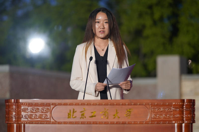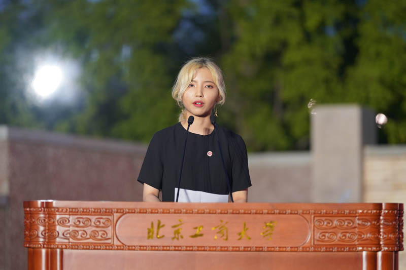 校學(xué)生會(huì)主席、商學(xué)院工商17全英班劉雨薇代表在校生歡迎學(xué)弟學(xué)妹們成為北工商的新主人,并分享了怎樣完成從高中生到大學(xué)生的完美蛻變,怎樣離夢(mèng)想更近。她希望大家“不要害怕”:不要害怕堅(jiān)持學(xué)習(xí),不要害怕成為北工商的主人,不要害怕聚光燈給予的明亮,不要害怕過(guò)簡(jiǎn)單的生活。她勉勵(lì)大家秉承“求真、立德、勤奮、創(chuàng)新”的校訓(xùn),勇于嘗試,勇于尋找,勇于改變,不斷去探索一切的可能,譜寫人生最華美的樂(lè)章。