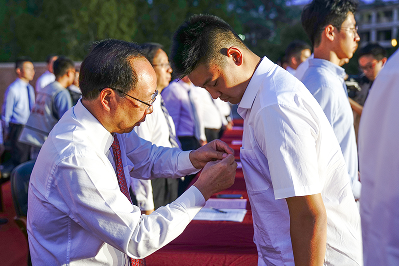首先進(jìn)行的是新生校徽佩戴儀式。迎新報(bào)到現(xiàn)場(chǎng),每位新生都領(lǐng)到了學(xué)校精心制作的校徽。小小的校徽承載著學(xué)校69年辦學(xué)歷史和“求真、立德、勤奮、創(chuàng)新”的校訓(xùn),是學(xué)校精神和校園文化的集中體現(xiàn)。校領(lǐng)導(dǎo)為新生代表佩戴校徽,全體新生也起立自行將校徽佩戴于左胸前。新生們帶上校徽,從此成為北工商人。