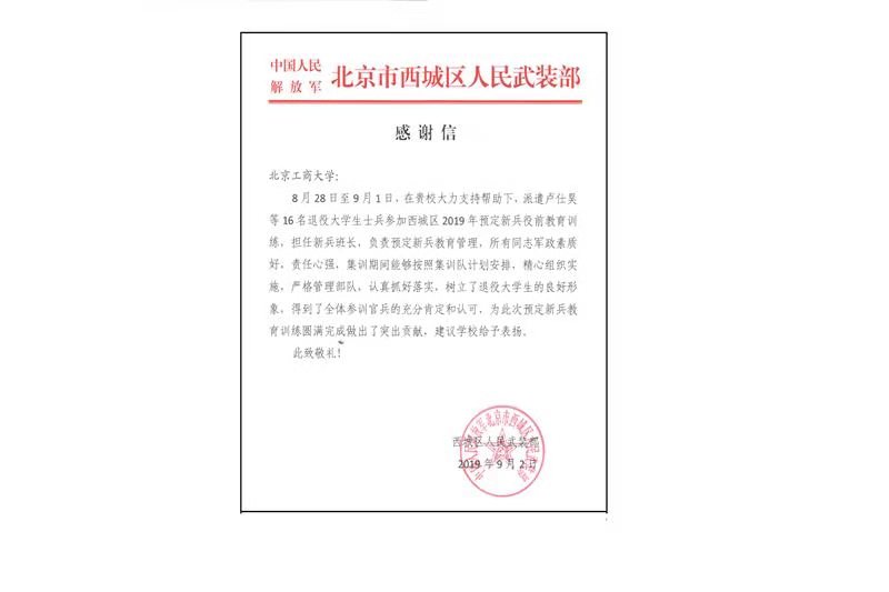 9月3日,西城區人民武裝部向我校發來感謝信,高度贊揚我校16名退伍大學生在西城區新兵役前教育訓練工作中所做的突出貢獻,感謝學校對征兵工作的大力支持。