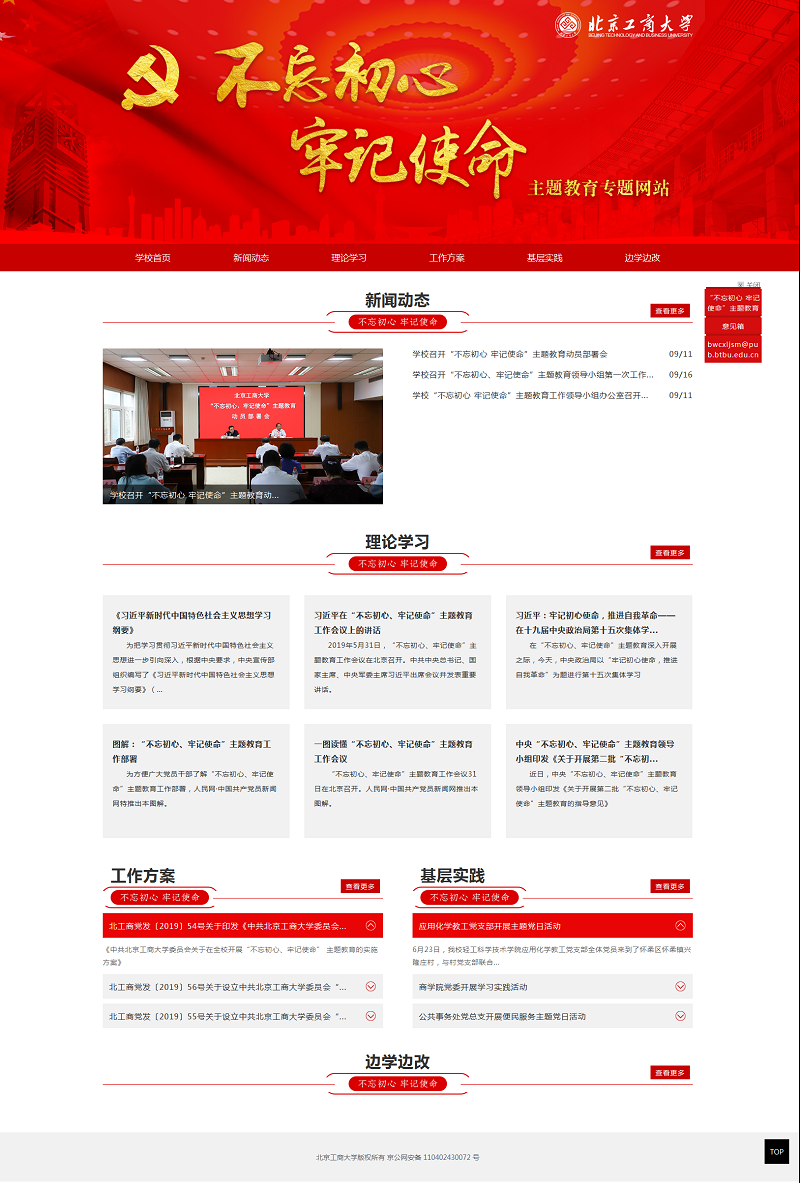 該專題網站的上線,為各單位認真貫徹落實《中共北京工商大學委員會關于在全校開展“不忘初心、牢記使命” 主題教育的實施方案》,主動宣傳報道本單位學習動態、有效做法、整改落實,提供了重要的學習平臺和報道窗口。隨后,將為各單位開通主題教育網站投稿權限,歡迎各單位通過新聞網后臺踴躍提供相關稿件。