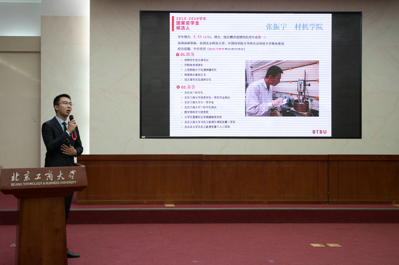評審會在莊嚴的國歌聲中開幕。來自11個學院的32名國家獎學金候選人按照抽簽順序依次上臺,通過3分鐘的演示文稿展示自己在學習、科研、學生工作、社會實踐、競賽獲獎、志愿服務等方面取得的成績。理學院賓凡淳連續(xù)3年績點和綜合測評專業(yè)第一,作為體育舞蹈隊的一員,多次參加國家級、市級比賽并獲得一等獎;數學與統計學院趙玉雪在數學分析、常微分方程等5門專業(yè)課程中取得滿分成績;輕工科學技術學院的楊蘊格在保持績點綜測專業(yè)第一的成績下積極競賽,獲得全國數學競賽二等獎,物理競賽三等獎和北京市數學競賽一等獎等榮譽;材料與機械工程學院魏姍姍是智能車的頭號玩家,現已被清華大學機械系擬錄取;計算機與信息工程學院劉紫鳳成績優(yōu)異,競賽獲獎20余次,累計參加溫暖衣冬等實踐活動多達50余次;計算機與信息工程學院巴文嵐在電路原理、概率論與數理統計等6門課程取得滿分成績,并獲得單科學習優(yōu)秀獎學金;經濟學院黃永健熱愛所學專業(yè),已獲得中央財經大學金融學院金融工程碩博連讀保研擬錄取資格;商學院黃永剛同學積極進取、勇于拼搏,共獲各級比賽獎項40余項,發(fā)表學術論文5篇,競賽科研雙豐收;法學院胡延杰同用所思所學為法律和正義發(fā)聲,大學期間征戰(zhàn)模擬法庭比賽、辯論賽超過70場;外國語學院侯雅婷踐行外語加黨建,雙語傳播中國故事,以己所長服務國家,獲北京市優(yōu)秀學生干部;藝術與傳媒學院李昕澍獲校級以上獎項12項,所在創(chuàng)業(yè)團隊平臺月流水10萬余元,學習創(chuàng)業(yè)兩手抓。候選人的優(yōu)秀事跡贏得了現場評委、老師熱烈的掌聲。