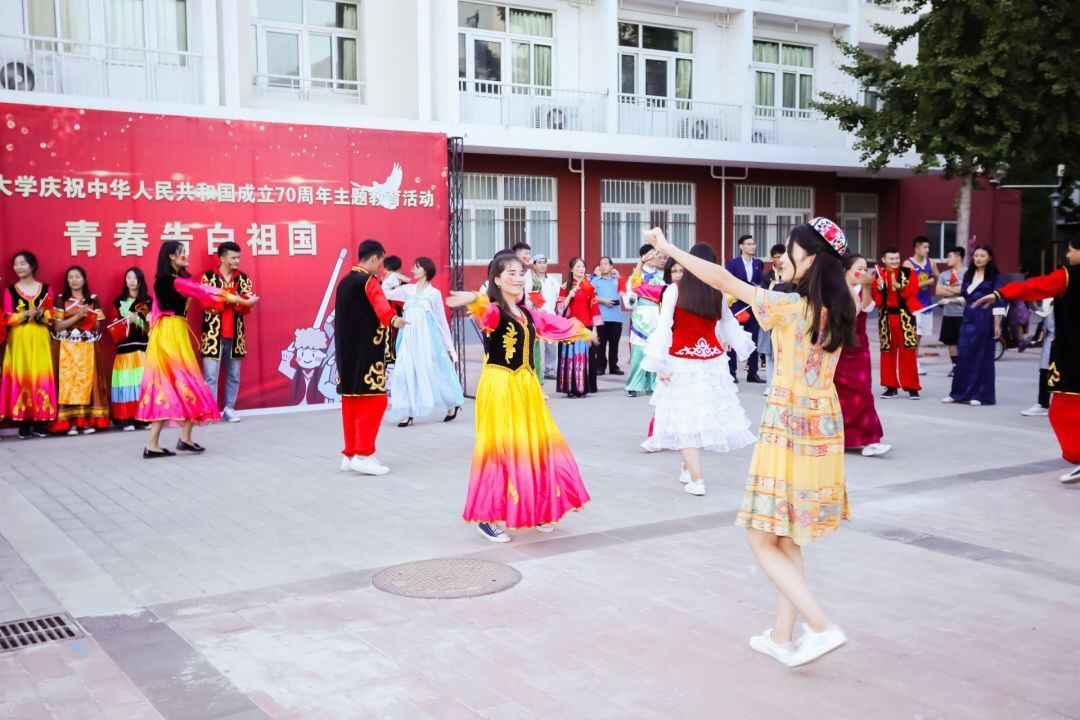 悠揚的《愛我中華》音樂聲響起,各民族同學隨著音樂翩翩起舞,歡快的旋律、動人的舞姿,充分抒發了北工商學子對偉大祖國母親真摯的熱愛。富有民族特色的服飾,有節奏感的舞步,引發強烈共鳴的愛國主義歌曲,立刻吸引了路過的同學,他們也紛紛加入,參與了自由舞蹈環節,熱情洋溢的表情、輕松愉悅的氛圍,訴說著北工商學子拳拳愛國之心。