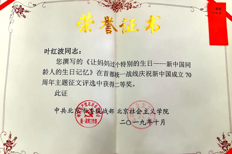10月16日,北京市委統戰部召開“同心同行七十年·堅定不移跟黨走”首都統一戰線慶祝新中國成立70周年主題征文活動總結表彰會。我校中國民主促進會支部副主任葉紅波老師撰寫的征文《讓媽媽過個特別的生日》榮獲二等獎。