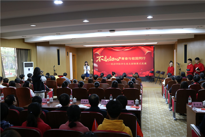 10月24日下午,經濟學院的學生黨校課堂上,學員們目不轉睛,舞臺上一幕幕或激昂或深情的演出不時贏得陣陣掌聲,理論導師、學生黨員們正在通過一堂“不忘初心·青春與祖國同行”情景式黨課,將黨支部和學生黨員的日常近距離全景式呈現給黨校學員。