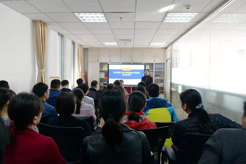 北京師范大學機關黨委專職副書記廖英迎接大家的到來,并做題為“北京師范大學不斷加強機關黨建的實踐與思考”的專題報告。報告主要從機關黨員和黨組織的基本情況,支部建在連上,支部活力哪里來,機關黨建工作的主要做法以及機關黨建中的問題與思考等五個方面進行講解。廖英結合北京師范大學機關工作實際及自身專職黨務工作的經驗,深入講解通過機關黨建工作切實促進機關作風建設,提升機關工作能力,優化機關格局,最終提高工作實效,提高師生滿意度的全過程。講解以黨建理論結合黨建工作實務,深入淺出,使大家受益匪淺。