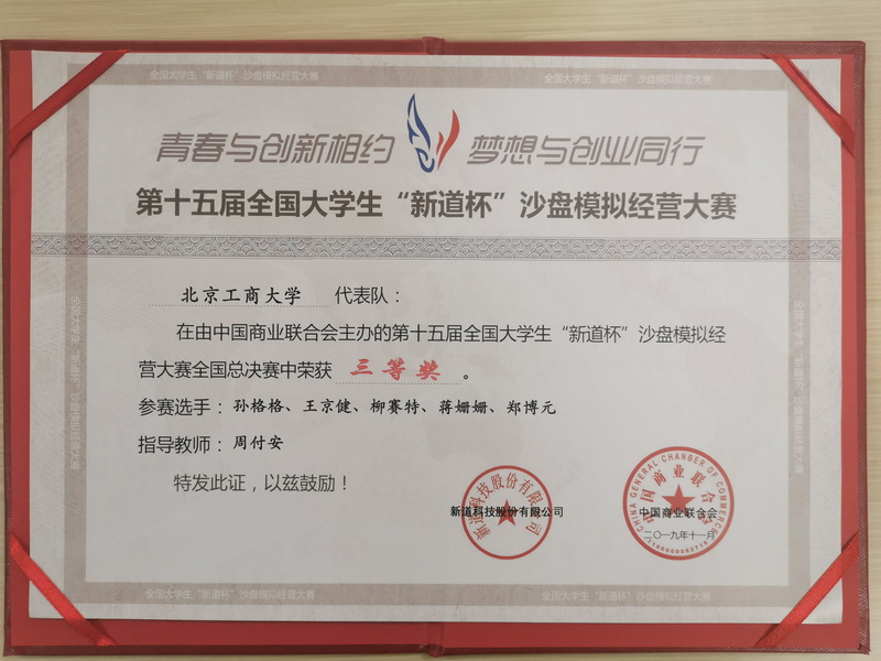 11月15日至17日,由中國商業聯合會主辦,金陵科技學院承辦,新道科技有限公司提供技術支持的“第十五屆新道杯全國大學生企業模擬經營大賽(本科組)總決賽”在南京金陵科技學院舉行。來自全國30個省市自治區100多所高校的120支隊伍參加比賽。由我校經濟學院文科實踐中心組織,周付安、田芬老師指導的參賽代表隊榮獲了三等獎。