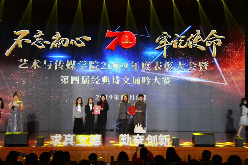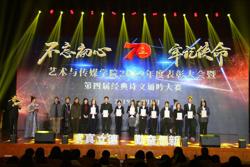 為深入推進“不忘初心、牢記使命”主題教育,紀念一二·九運動84周年,同時表彰先進集體和個人,弘揚愛國主義精神,傳承中華優秀傳統文化。12月8日,藝傳學院舉辦2019年度學生表彰大會暨第四屆經典詩文誦吟大賽。學院黨委書記高麗華、院長王擎、副院長劉紅菊、學院黨委副書記鄭光、院長助理李杰瓊及學院部分教職工出席大會,獲獎學生代表、全體學生黨員、團學干部、2019級學生以及部分高年級學生等共計700余人參會。