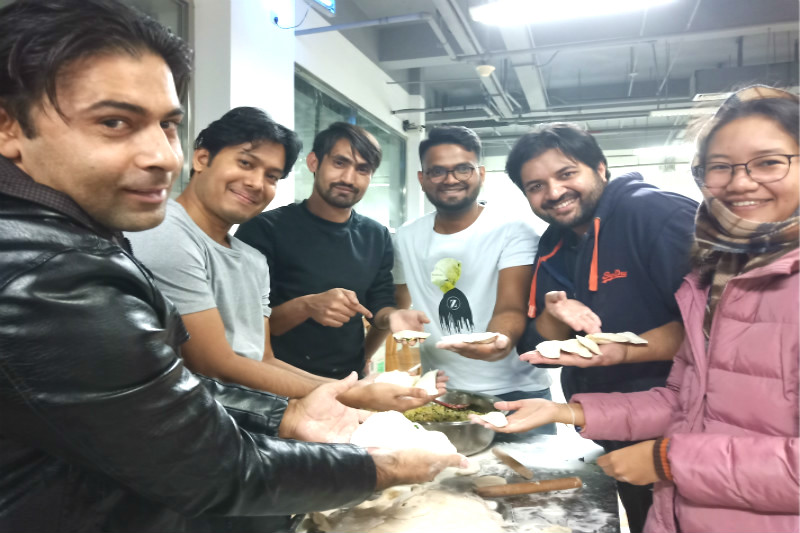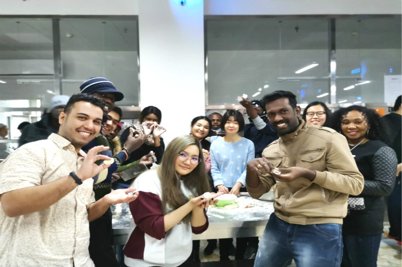 公共事務處高度重視此項活動并做了充分的前期安排和準備,食堂工作人員根據國際學生的需求準備了不同的食材。國際學生們在中國志愿者的幫助下,逐漸掌握了包餃子的方法,大家興致勃勃參與活動,餃子數量逐漸增多。經過一個多小時的努力,大家吃上了自己包的熱騰騰的餃子,一位巴基斯坦的同學還興奮地向大家展示自己包的餃子,活動現場氣氛歡愉。