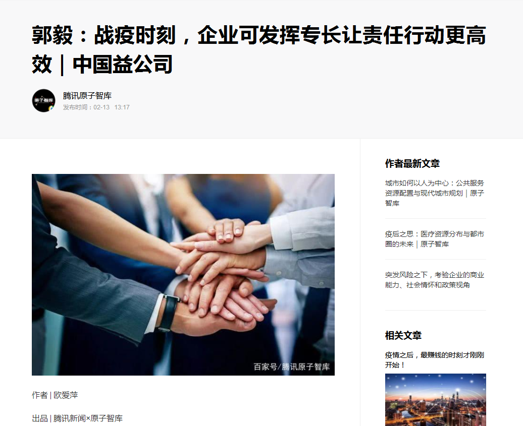 經(jīng)濟(jì)學(xué)院郭毅教授作為中國企業(yè)社會(huì)責(zé)任智庫、中國工業(yè)企業(yè)社會(huì)責(zé)任智庫、南方周末等多家機(jī)構(gòu)社會(huì)責(zé)任專家,就疫情防控期間中國各類企業(yè)的社會(huì)責(zé)任表現(xiàn),接受騰訊新聞、中國社會(huì)科學(xué)院《商學(xué)院》、中國建設(shè)報(bào)等媒體采訪。郭毅教授對此次疫情中企業(yè)所表現(xiàn)出來的社會(huì)責(zé)任意識高度肯定,指出中國企業(yè)并不缺乏社會(huì)責(zé)任擔(dān)當(dāng)?shù)穆呢?zé)意愿,也在市場化、國際化發(fā)展中獲得了參與社會(huì)治理的綜合能力,企業(yè)社會(huì)責(zé)任可以也應(yīng)該成為新時(shí)代構(gòu)建社會(huì)治理共同體的重要治理能力來源。建議政府主管部門給與企業(yè)更多信任,授權(quán)企業(yè)或以公共服務(wù)購買等方式,充分發(fā)揮企業(yè)在信息、物流、專業(yè)物資生產(chǎn)、民眾社會(huì)生活等方面的專業(yè)優(yōu)勢,使其參與到疫情控制和穩(wěn)定社會(huì)的工作當(dāng)中,形成有效的政府行動(dòng)、企業(yè)責(zé)任行動(dòng)與社會(huì)組織公益行動(dòng)之間的對接機(jī)制,構(gòu)建非常時(shí)期社會(huì)治理共同體。