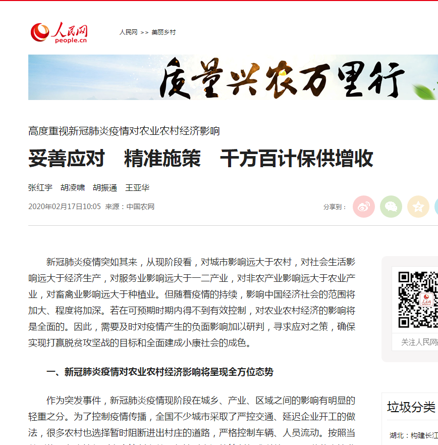 該報(bào)告指出疫情對農(nóng)業(yè)產(chǎn)業(yè)的沖擊是全面的,提出必須要強(qiáng)化流通管理,保障菜籃子產(chǎn)品供給,抓好春耕春播工作,穩(wěn)妥有序推動(dòng)農(nóng)民工返程務(wù)工等對策思路和建議。2月25日,《人民日報(bào)》刊發(fā)胡凌嘯作為主要完成人的文章《科學(xué)應(yīng)對疫情對農(nóng)業(yè)農(nóng)村經(jīng)濟(jì)的影響》,該文章分析了此次疫情暴露出的農(nóng)業(yè)農(nóng)村領(lǐng)域的多重安全危機(jī)及危機(jī)的形成原因,著眼于保持我國農(nóng)業(yè)農(nóng)村經(jīng)濟(jì)社會(huì)安全穩(wěn)定,提出了全面加強(qiáng)農(nóng)業(yè)農(nóng)村危機(jī)管理的建議。報(bào)告得到中央領(lǐng)導(dǎo)的批示,并被《學(xué)習(xí)強(qiáng)國》轉(zhuǎn)載。