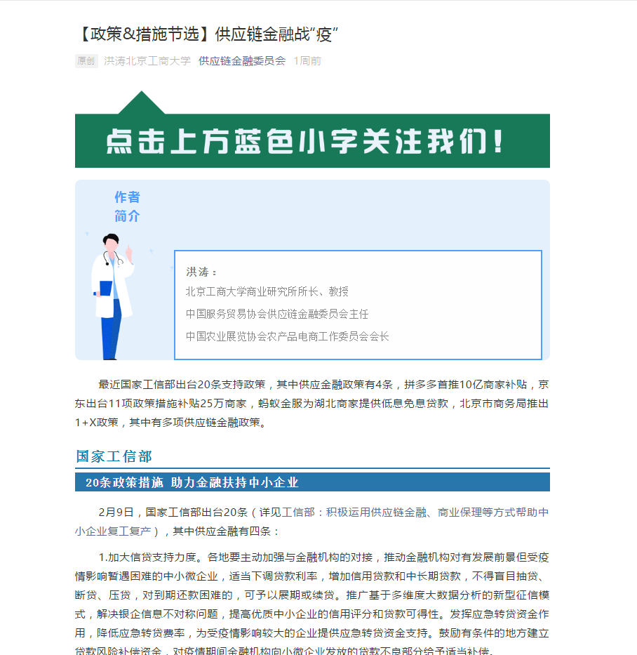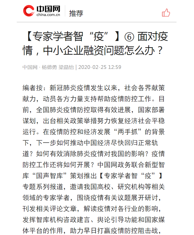 《疫情之下如何為中小企業(yè)解決融資困難問題》一文還被“國聲智庫”聯(lián)合《中國網(wǎng)》策劃的專家學(xué)者智“疫”專題活動(dòng)采納,該文章分析了疫情對中小企業(yè)融資產(chǎn)生的近期和遠(yuǎn)期影響,分別對中小企業(yè)、金融機(jī)構(gòu)、金融市場和政府部門提出政策建議。文章強(qiáng)調(diào)金融機(jī)構(gòu)在風(fēng)險(xiǎn)防范的前提下,盡快推出疫情背景下的新型金融產(chǎn)品,以解中小企業(yè)融資的燃眉之急;政府應(yīng)適時(shí)推出新的財(cái)稅政策和產(chǎn)業(yè)政策,以降低中小企業(yè)的負(fù)擔(dān),迅速恢復(fù)生產(chǎn)。文章一經(jīng)刊發(fā),即引起人民銀行等監(jiān)管部門、金融機(jī)構(gòu)和企業(yè)界的重視,一些建議已經(jīng)在國家近期出臺(tái)的相關(guān)金融政策中得以體現(xiàn)。