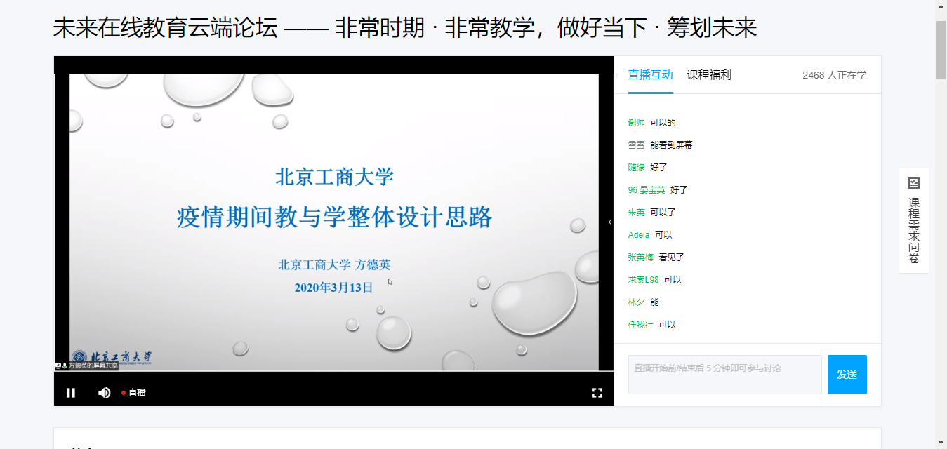 抗“疫”期間,全國各級(jí)各類教育工作者基于互聯(lián)網(wǎng)開展了形式多樣的教與學(xué)活動(dòng),北京師范大學(xué)未來教育高精尖創(chuàng)新中心聯(lián)合騰訊教育,以“非常時(shí)期·非常教學(xué),做好當(dāng)下·籌劃未來”為主題,舉辦了“未來在線教育云端論壇”,論壇邀請(qǐng)了全國頂尖的教育專家、校長代表和企業(yè)精英,采用網(wǎng)絡(luò)直播互動(dòng)的形式,共同分析新時(shí)代在線教與學(xué)的實(shí)施路徑和方法,探討未來在線教育的發(fā)展方向。副校長方德英應(yīng)邀出席論壇。 3月14日,方德英副校長在論壇中做了題為《在線教與學(xué)高校之行-北京工商大學(xué)疫情期間教與學(xué)整體設(shè)計(jì)》的發(fā)言,從在線教與學(xué)整體設(shè)計(jì)原則、教學(xué)形式與方式的思考、當(dāng)前兩個(gè)方面的不足進(jìn)行分析闡述。他談到,在線教育應(yīng)以時(shí)空范圍內(nèi)優(yōu)化資源為本,充分利用信息技術(shù)將校內(nèi)校外、國內(nèi)國外,本碩博及繼續(xù)教育的資源打通,不斷完善教育管理體系,不僅將網(wǎng)絡(luò)教學(xué)作為應(yīng)對(duì)特殊時(shí)期教育的權(quán)宜之計(jì),而是在促進(jìn)信息技術(shù)與教育教學(xué)的深度融合方面能有更深遠(yuǎn)的發(fā)展。 論壇分析盤點(diǎn)了全國在線教育發(fā)展的新態(tài)勢(shì),研討如何基于互聯(lián)網(wǎng)開展更加高效、有價(jià)值的在線教育教學(xué)活動(dòng),并由此思考與凝練未來教育與未來學(xué)校的發(fā)展新思路,對(duì)做好當(dāng)前應(yīng)急服務(wù),并構(gòu)建學(xué)校教育與在線教育深度融合的新生態(tài)具有重要的意義。