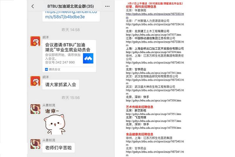 2020的春季校招工作,隨著各地陸續的復工復產,以別開生面的形式拉開了序幕。開學以來,學校高度重視因疫情滯留湖北畢業生就業進展情況。在學校黨委行政總體部署下,招生就業處多措并舉、主動出擊,積極打通學校就業工作連接在鄂畢業生最后一公里,為他們送去學校的關懷與支持。 齊聚“云”端 共筑援鄂橋梁 3月16日下午,學校招生就業處通過視頻連線形式,面向我校2020屆湖北籍及滯留湖北的尚未簽約畢業生開展了一場特殊的就業動員活動。招生就業處副處長石松、研究生院副院長郭新愿,各相關學院副書記、輔導員隔空到會,共同參與了本次線上就業動員。本次是我校首次嘗試線上形式開展畢業生動員工作,參會師生深入交流,活動“現場”氣氛熱烈。 在招生就業處精心安排下,活動由我校計算機與信息工程學院湖北籍輔導員胡洋擔任主持。開場后胡老師用畢業生熟悉的鄉音,拉近了與在鄂畢業生之間的距離。各學院輔導員分別帶來暖場問候。石松代表學校,向身處湖北疫區的畢業生致以誠摯問候并送上深切祝福,同時向畢業生傳達了教育部“24365校園聯合招聘服務”以及北京市“畢業生春季網絡招聘月活動”,詳細介紹學校為畢業生準備的各項福利措施與幫扶政策。勉勵畢業生積極參與春招活動,希望大家不斷提升就業能力、完善自我,在學校的陪伴與支持下充分把握機遇、成功就業。 現身說法 直擊痛點問題 招生就業處就業中心各位老師向畢業生介紹了自己負責的業務范疇,歡迎大家樹立積極的就業觀,主動的進行就業咨詢、認真關注學校推送的招聘信息,同時提醒畢業生就業過程中注意人身財產及信息安全、妥善辦理個人就業手續;經濟學院衛一潤、食品與健康學院門一帆、藝術與傳媒學院程遠三位老師,分別從學科專業以及就業指導等方面,對畢業生進行鼓勵與動員;食品與健康學院楊梓妍、藝術與傳媒學院范璟萱作為畢業生代表發言,二位同學對學校的高度重視與幫扶表達深深地感謝,同時分享身求職經歷與感受,并提出當前遇到的問題。石松對于畢業生提出的相關問題予以相應的解答,并希望畢業生在就業過程中有困難的時候,積極與學校取得聯系,招就處就業中心將隨時提供專業的就業服務,助力畢業生順利就業。 共克時艱 校院有效聯動 本次活動得到計算機與信息工程學院、經濟學院、藝術與傳媒學院、食品與健康學院、數學與統計學院、輕工科學技術學院、商學院、法學院等8個學院的大力支持。通過前期各院摸排統計,我校2020年本碩合計共有29名湖北籍畢業生。本次活動共有22名畢業生參加,其中湖北籍17人、因疫情滯留非湖北籍5人,均為參與考研或秋招尚未明確就業去向畢業生。招就處將以此活動為契機,協同各院密切跟蹤上述群體就業進展。在充分尊重畢業生意愿情況下,適時開展就業指導與崗位推薦工作,確保本次幫扶任務圓滿完成。