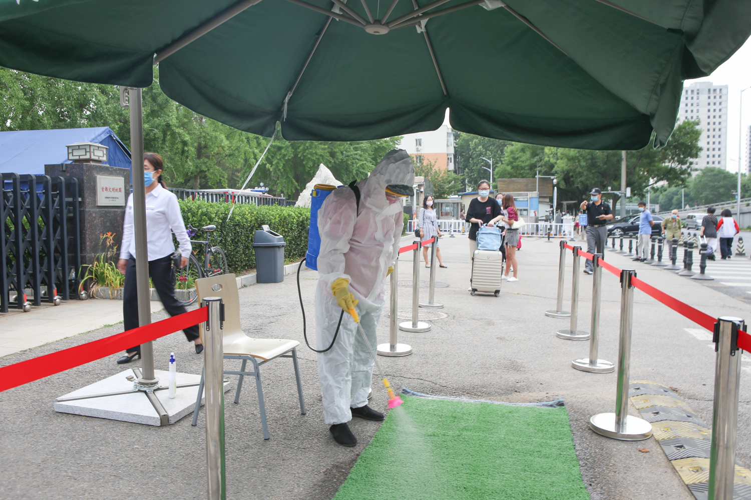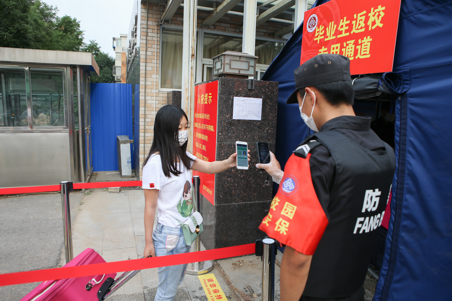 在學校阜成路西區南門、東區南門,保衛處加強校園和大門管控,實施人員進出分流,采用非接觸式熱感應測溫設備,提高人員入校速度。返校畢業生排隊等待入校,每位學生經過行李消殺、身份核驗、體溫初篩后入校。