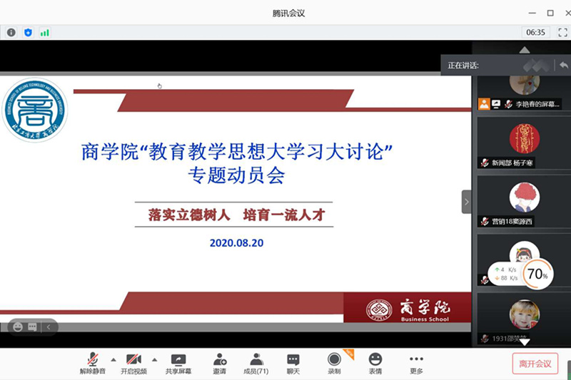 商學(xué)院于8月17日、20日召開兩場(chǎng)主題為“落實(shí)立德樹人,培育一流人才”的線上“教育教學(xué)思想大學(xué)習(xí)大討論”專題動(dòng)員會(huì)議,累計(jì)150余名師生參加動(dòng)員會(huì)議。學(xué)院黨委副書記張倩,全體輔導(dǎo)員、本研學(xué)生黨支部書記、團(tuán)學(xué)干部、各班骨干等參加此次會(huì)議。會(huì)議由團(tuán)委書記李艷春主持。