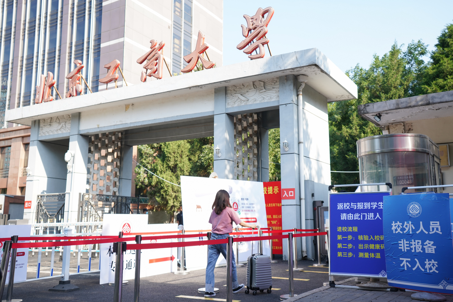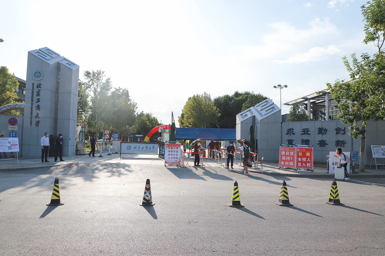 行李消殺,出示入校碼、健康碼、測量體溫,……返校現場,同學們在工作人員的引導下,嚴格按照步驟和要求有序返校。為確保學生快速安全進校,學校保衛處專門增加人員配置,在各校門安裝紅外測溫設備、一卡通刷卡系統、應急防疫帳篷等,嚴格落實疫情防控管理要求。信息網絡中心及時完成門禁專網的搭建及入校設備的安裝調試,完成了入校身份識別系統的建設,研發了學生返校和請假系統,學生可以直接通過“掌上北工商APP”完成返校和請假全流程。人工智能學院信息171班李麟杰談到:“學校的疫情防控措施很全面,特別是掌上北工商APP,使用便捷,極大提升了返校效率,今天返校流程特別順暢。”