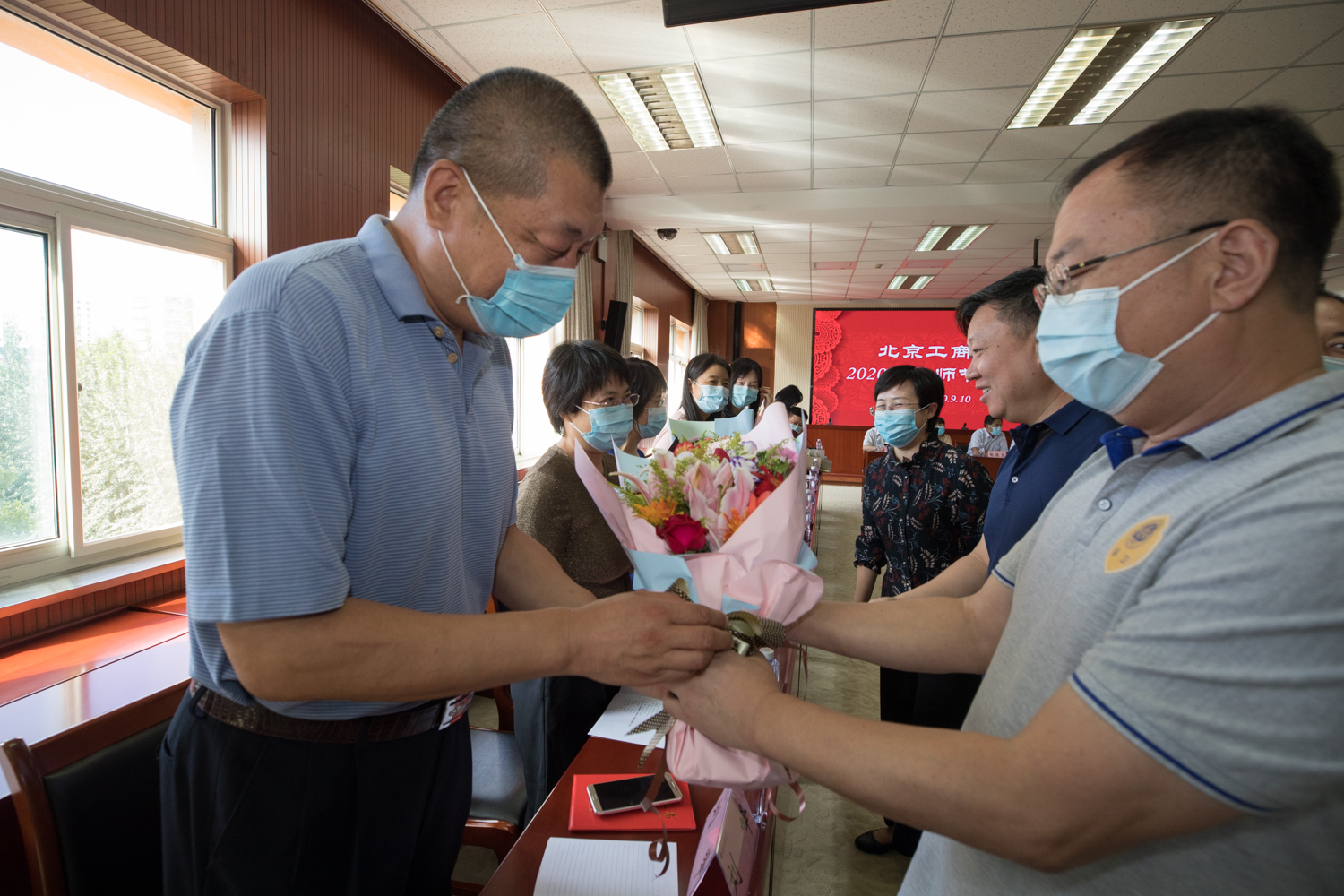 全體校領導為2020年學校從事教育工作滿30年教齡的教職工代表頒發證書。黨委書記黃先開和校長孫寶國為獲得市級以上表彰的優秀團隊和個人代表頒發證書。職能部門負責人為優秀教職工代表獻花。