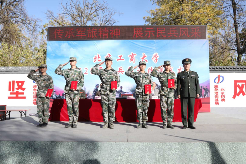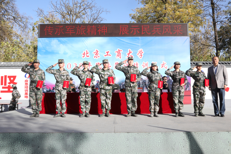 儀式在莊嚴的升旗儀式中拉開帷幕。在匯報表演環節中,男女民兵隊員先后進行了警棍盾牌操、軍警棍術、擒敵拳、匕首操和綜合反恐科目表演,向各級領導匯報訓練成果。隊員們嘹亮的口號、高昂的士氣、整齊有力的動作、貼近實戰的表演科目贏得了現場觀眾的熱烈掌聲。匯報表演結束后,全體民兵隊員面向民兵連連旗宣誓,表達了“忠實履行國防義務,隨時響應國家號令,參軍參戰,永不背叛祖國”的決心。隨后,民兵連七班班長馮亮、二班隊員張舸分別代表民兵骨干和隊員發言,分享了參加此次民兵集訓的收獲和展望。許峰宣讀了《關于表彰北京工商大學2020年民兵集訓優秀個人的決定》,在場領導為12名“優秀民兵隊員”、8名“優秀民兵班長”、6名“突出貢獻獎”獲得者頒發了榮譽證書。