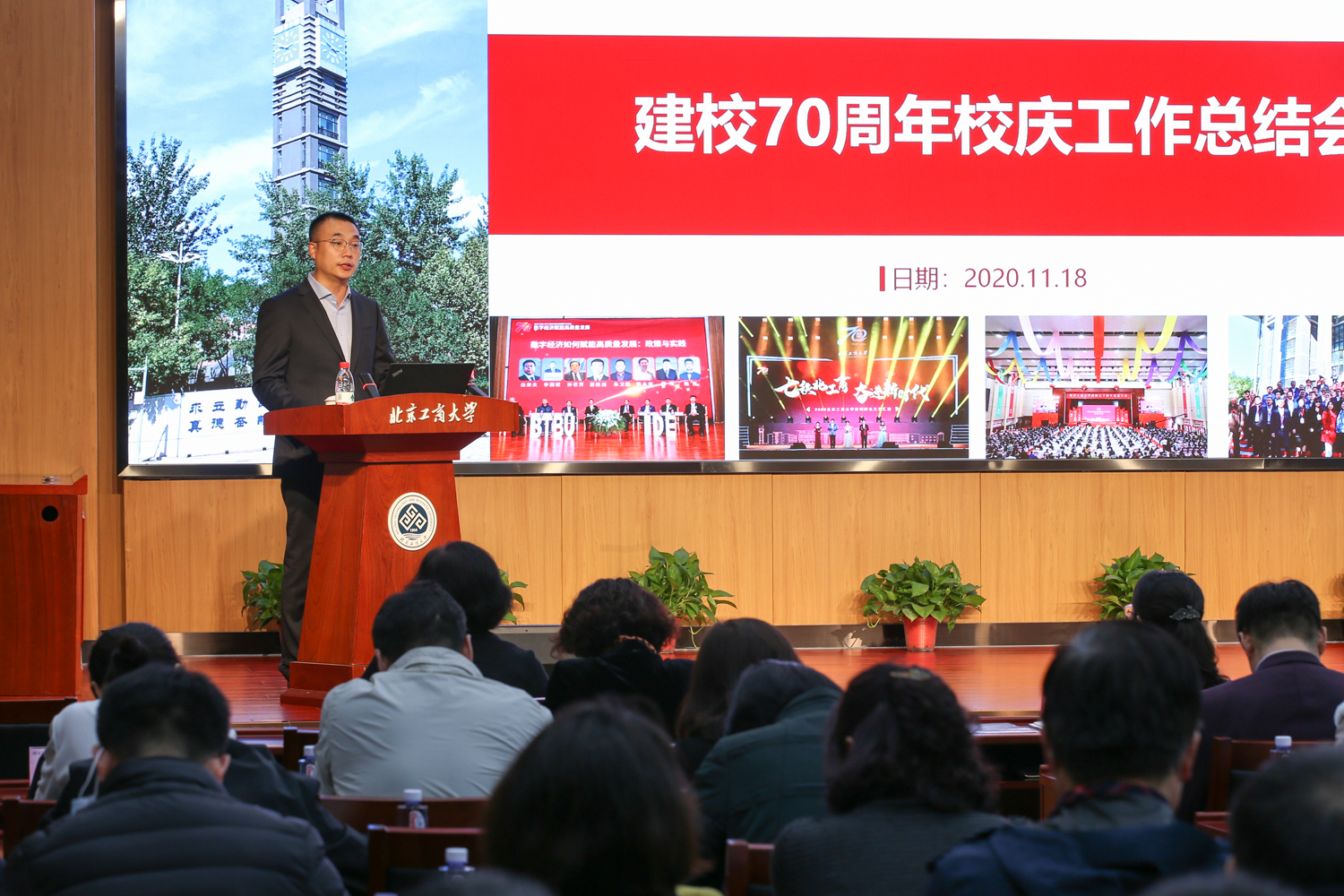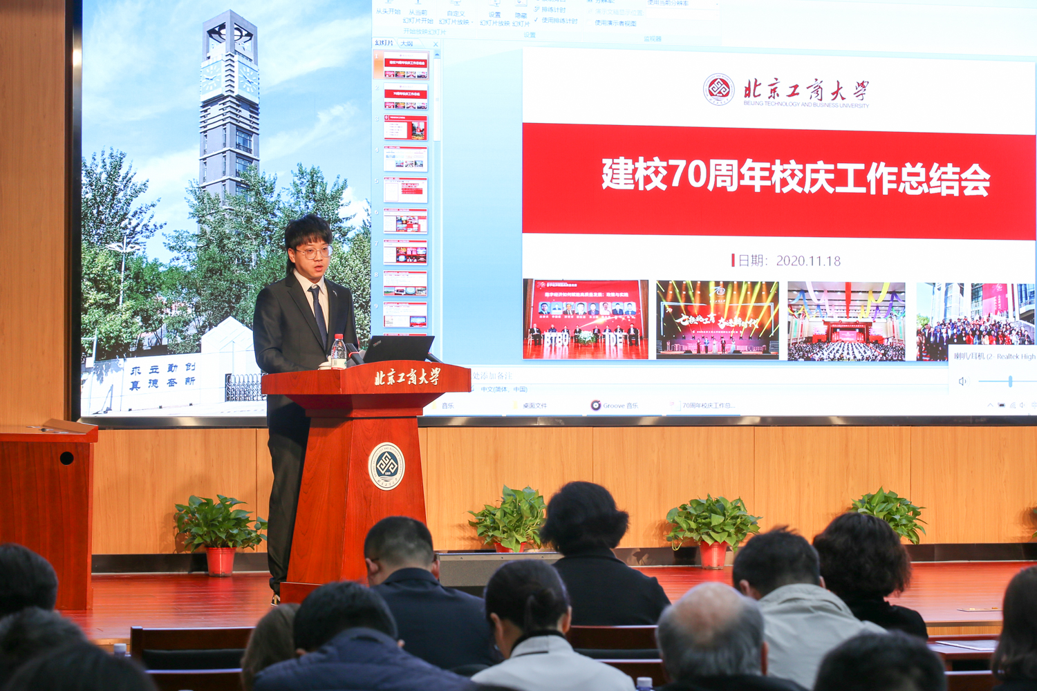 孫寶國校長在總結講話中指出,建校70周年校慶慶祝活動得到了上級領導的關心支持、各級黨委政府厚愛、廣大校友和社會各界的傾情相助,他代表學校向關心支持學校發展的各級領導,向鼎力支持母校的廣大校友及社會各界,向在70周年校慶工作中付出辛勤勞動、作出重要貢獻的廣大干部師生員工、志愿者表示衷心的感謝。他指出,此次校慶活動在疫情防控常態化條件下舉行,難點大、困難多,本著“隆重、熱烈、簡樸、高效”的原則,全體北工商師生員工團結一心、聚精匯力,使校慶系列活動達到了預期的效果。他指出,此次活動具有參會嘉賓校友規格高、校慶晚會和慶祝大會質量高、校友捐助數額大、師生校友參與度高等特色和亮點,凝聚了人心,鼓舞了士氣,豐富了校園文化,既是對北工商辦學成就的全面總結,更是北工商人奮力前行、共謀發展的新起點。孫寶國校長展望了學校的發展前景,強調到百年校慶時,北工商將建成具有商科、輕工和食品特色的世界一流大學。希望全校師生以此為目標,統一認識、凝聚共識,奮力開創新時代學校教育事業發展的新局面,為中華民族偉大復興作出應有的貢獻。了我校“創意傳播校內創新實踐基地”在教學改革與實踐創新所取得的成果。