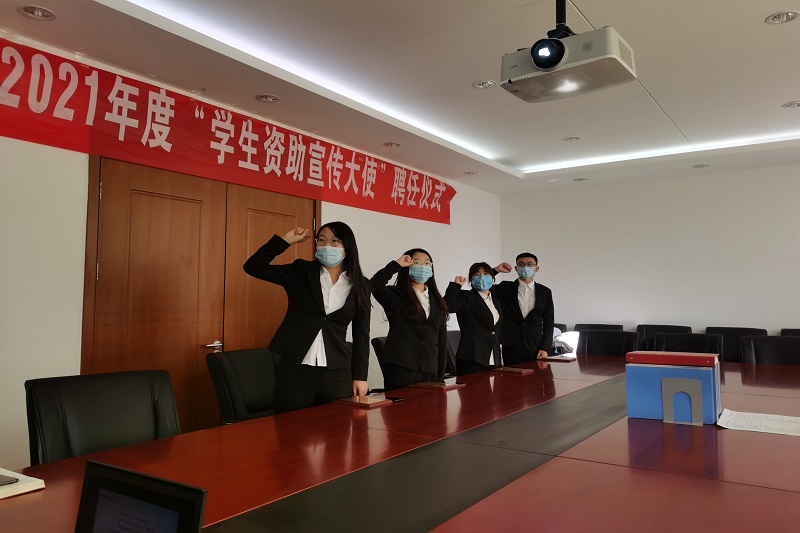 2021年度“學生資助宣傳大使”招募工作開展以來,受到了同學們的廣泛關注和積極響應,經由個人申請、學院推薦、資助中心組織考核答辯,共有25名品學兼優的國家獎學金、國家勵志獎學金獲得者成為2021年度“學生資助宣傳大使”。會上,許峰宣讀了《關于聘任2021年度“學生資助宣傳大使”的決定》,呂良和許峰在兩個會場分別為新聘大使頒發聘書。25名新聘大使莊嚴宣誓,立志為更多的貧困學子點燃希望,用真心、真情去傳播愛的種子。