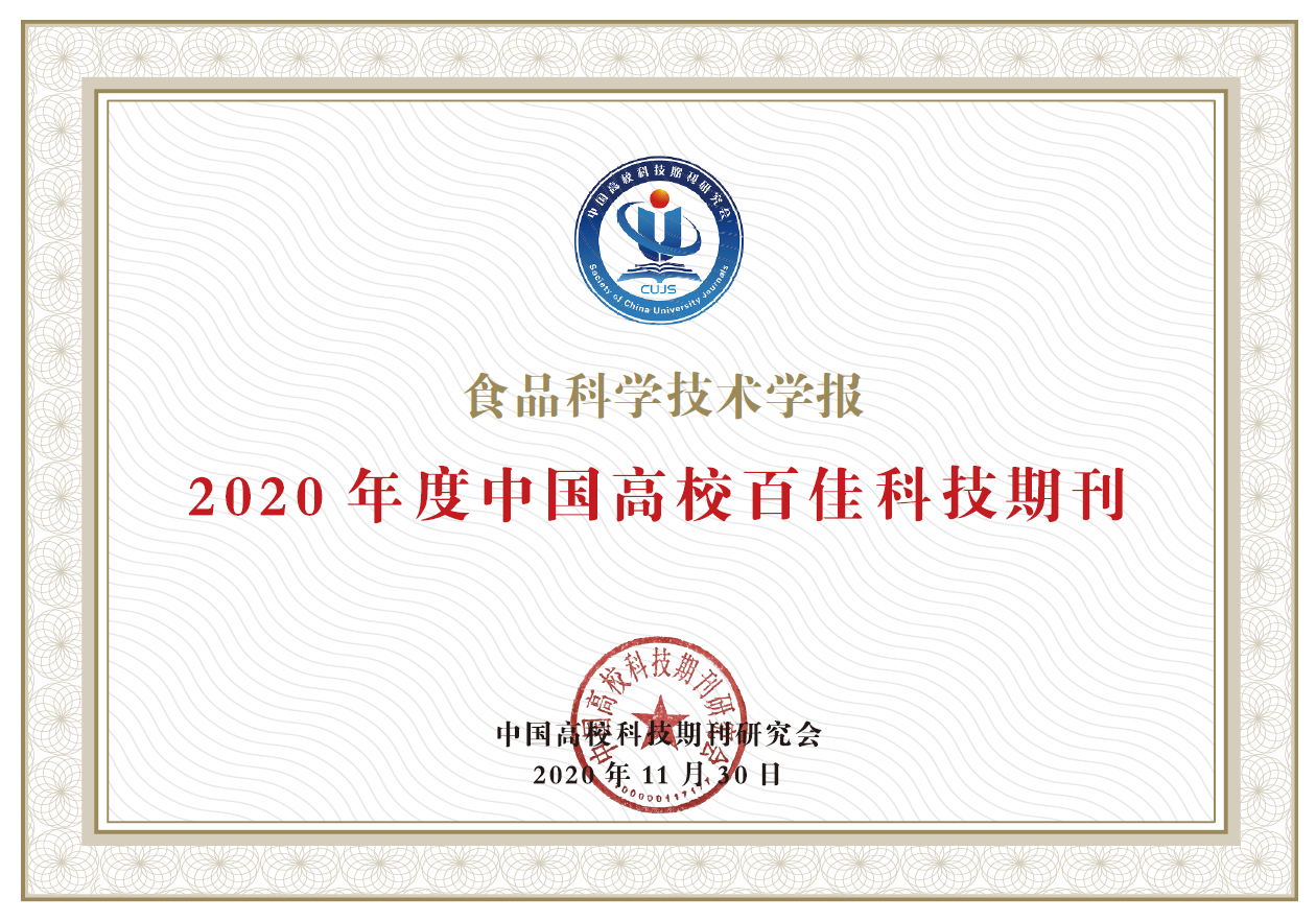 近日,在中國高校科技期刊研究會組織的“高校優(yōu)秀科技期刊”遴選活動中,我校《食品科學(xué)技術(shù)學(xué)報》被評為“2020年度中國高校百佳科技期刊”。這是自2020年10月,《食品科學(xué)技術(shù)學(xué)報》被評為“RCCSE中國權(quán)威學(xué)術(shù)期刊(A+)”以來,取得的又一項突破性成績。
