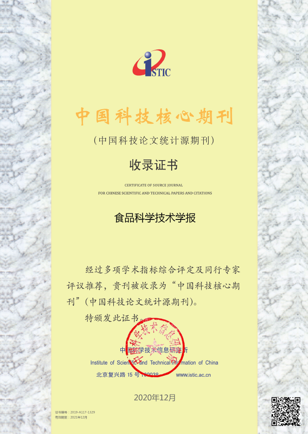另據(jù)中國科學(xué)技術(shù)信息研究所發(fā)布的2020年版《中國科技期刊引證報告》,《食品科學(xué)技術(shù)學(xué)報》擴展影響因子上升為3.50,連續(xù)6年位列食品行業(yè)期刊第1名;刊物的其他各項評價指標(biāo)穩(wěn)居食品行業(yè)期刊前列,同時期刊繼續(xù)入選“中國科技核心期刊”。中國知網(wǎng)發(fā)布的《2020中國學(xué)術(shù)期刊影響因子年報》顯示,《食品科學(xué)技術(shù)學(xué)報》復(fù)合影響因子繼續(xù)位列食品行業(yè)期刊第二名,再次入選中國學(xué)術(shù)期刊食品科學(xué)技術(shù)類影響力指數(shù)Q1區(qū)。
