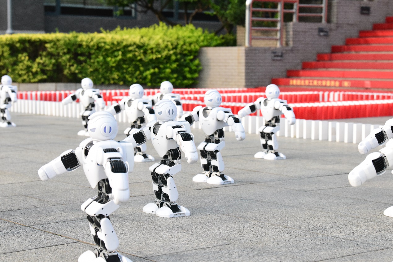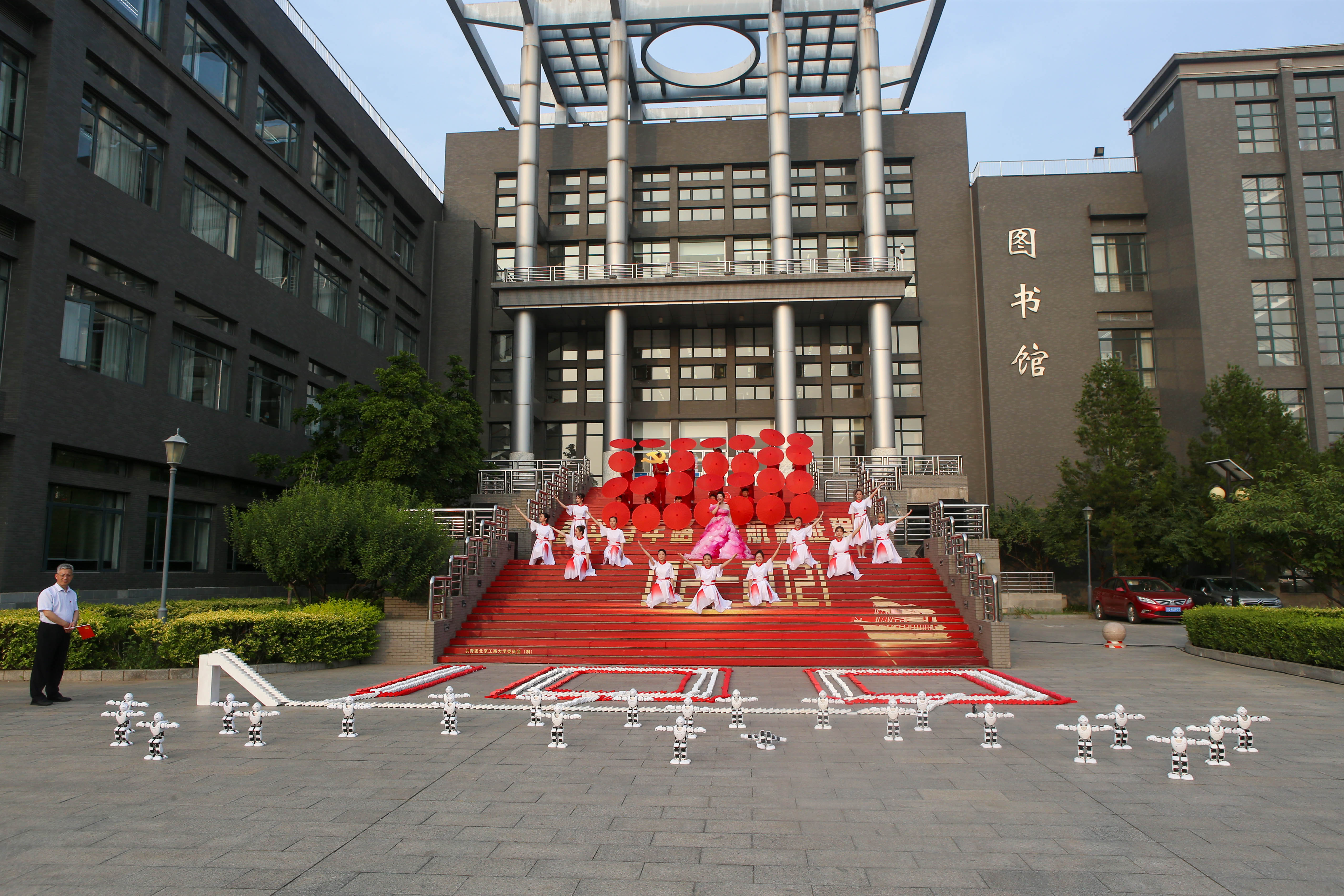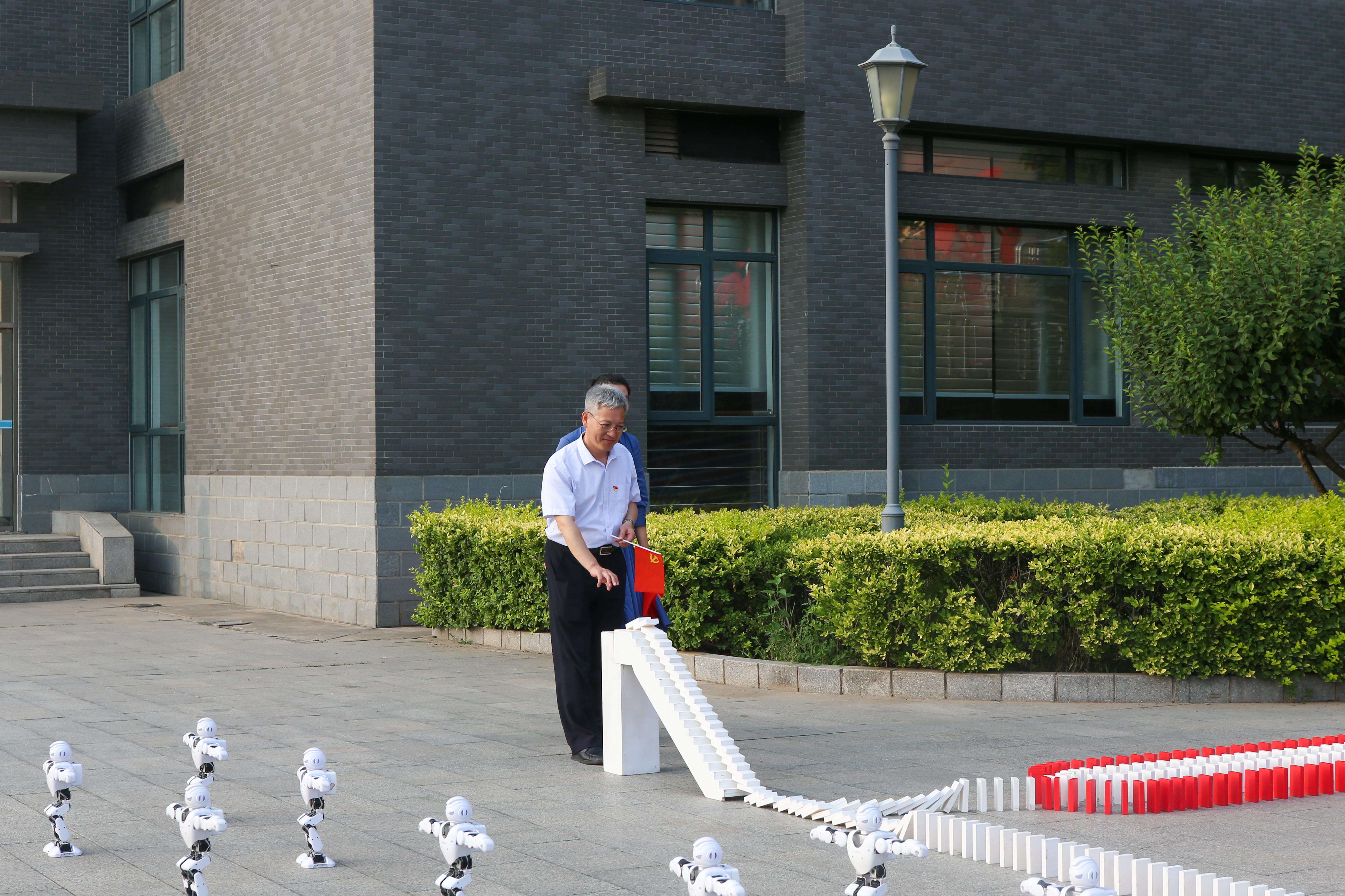 傍晚6時整,圖書館前成了一片紅色的海洋,20米紅色巨布鋪滿三層長階, 鐫刻著“1921-2021”的字樣和金色紅船的圖案,營造成熱烈而濃郁的氛圍,讓現場師生聯想到從上海石庫門到嘉興南湖,一艘小小紅船承載著人民的重托、民族的希望,越過急流險灘,穿過驚濤駭浪,航行百年,成為領航中國行穩致遠的巍巍巨輪。伴隨著管樂器吹奏著《唱支山歌給黨聽》悠揚樂曲,剛剛下課的同學們三三兩兩,紛紛循聲匯聚到圖書館前。管弦樂曲罷,領唱體育與藝術教學部丁璇用動聽而又極富感染力的歌聲唱響《我愛你,中國》,歌聲里滿是對祖國未來的憧憬和對黨百年征程的歌頌。紅色長階上數十名舞者身著白衣紅裙翩翩起舞,妙態絕倫。二十五個智能舞蹈機器人擺成黨徽的形狀,跟著歌聲的節奏跳動,整齊劃一,靈動的舞姿和可愛的形象俘獲了現場師生的心,象征著北工商學子整裝待發,開啟百年新征程的意志。人工智能學院的“NAO”機器人矗立在舞蹈機器人的前方,指引方向,代表著工商青年堅定信心跟黨走,始終堅持中國共產黨領導的信心。