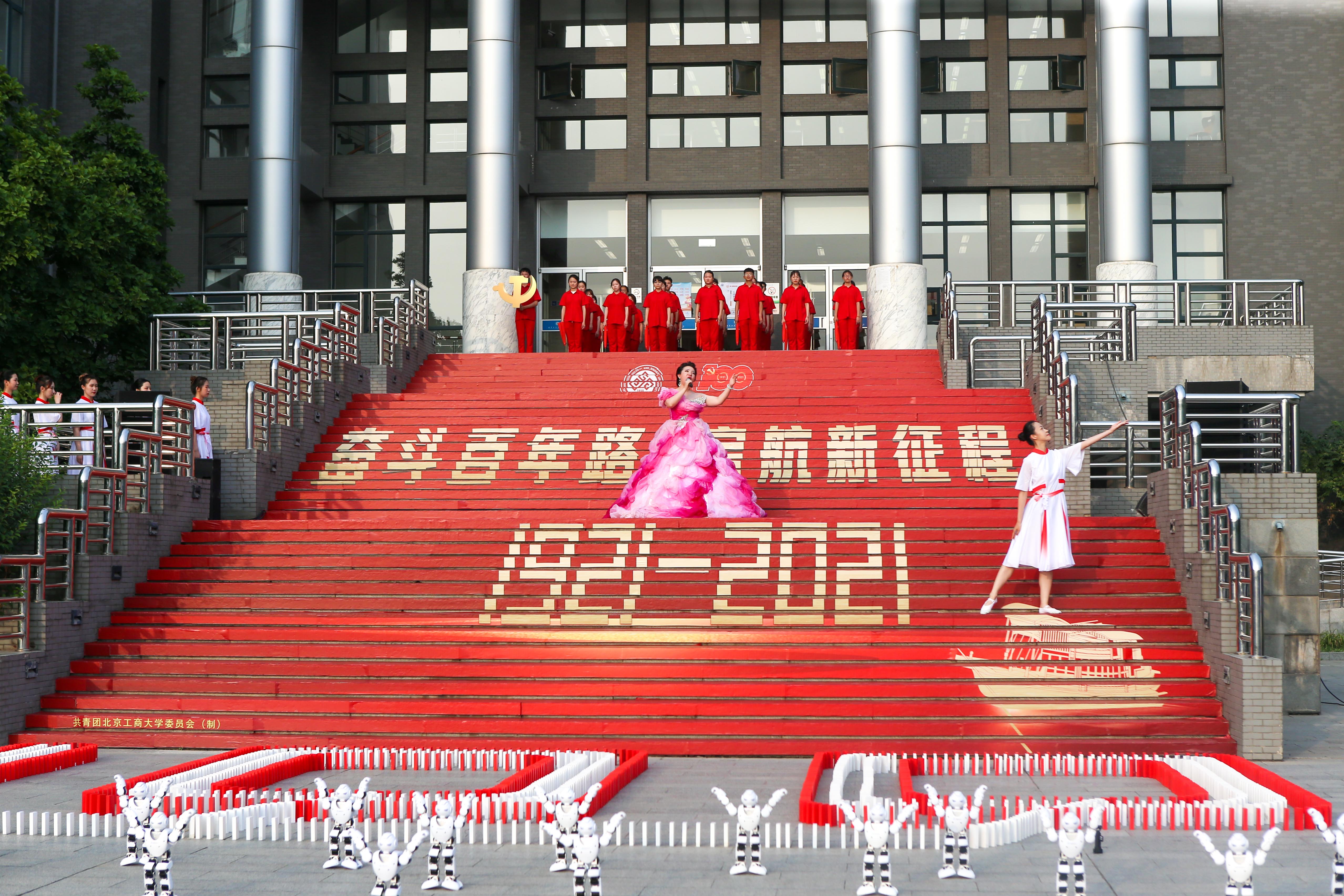 隨著歌聲緩緩落下,黨委副書記李中奇為大家開啟了北工商青年為黨的百年華誕準備的生日禮物,一塊塊的多米諾骨牌被推動起來,如同中國共產黨一步步走過的百年歷程,最終形成了紅白相間的巨大的“100”的畫面,面對黨旗,全場師生用青春的聲音和熱血喊出最響亮的口號:“奮斗百年路!啟航新征程!”