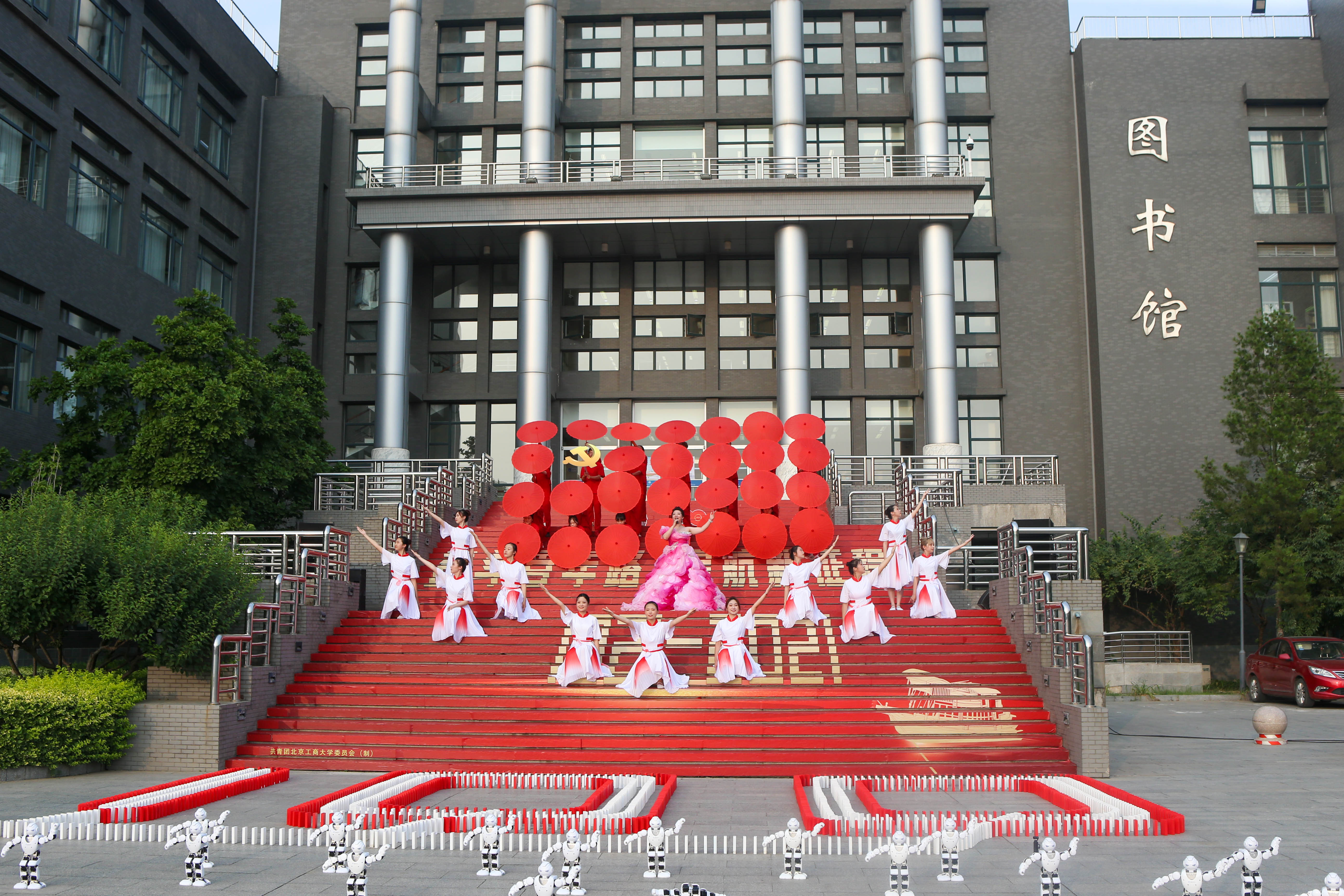在歌曲高潮響起時,一枚金光閃閃的黨輝從人群中高高舉起,一群身著紅衣手舉紅傘的學生們從圖書館臺階走下, 他們錯落有致的向黨輝聚攏,最終形成一面舞動著的熠熠生輝的鮮紅的“黨旗”,表達出北工商全體青年向偉大的中國共產黨靠攏,用赤誠熱血書寫青春芳華。鮮花與黨旗間,展現的是風華正茂的北工商青年的赤忱之心;歌聲悠揚中,傳出了北京工商大學全體師生建黨百年的誠摯祝福。