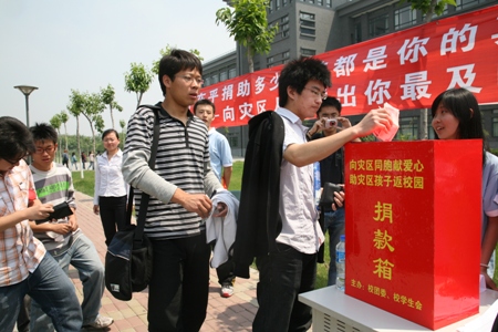 繼5月15日學校團委、校學生會、研究生會在良鄉、阜成路兩校區同時組織開展了為地震災區募捐活動后,16日,又陸續有同學主動捐款。