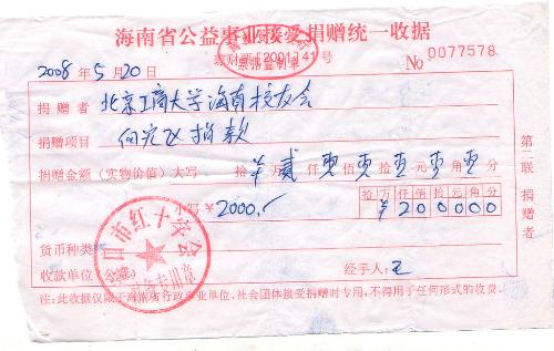 我校海南省校友會向汶川災區捐款2000元