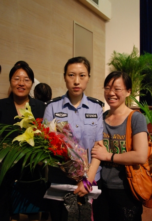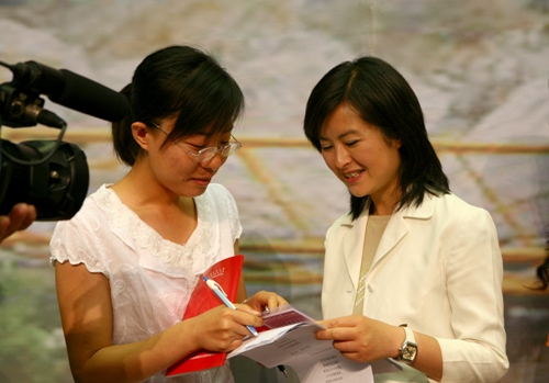 報告結束之后,我作為我校學生記者團的代表送給張泉靈一份特殊的禮物:一個北京工商大學學生記者團記者證。記者證上面印有張泉靈在災區工作時的照片,記者證的編號是0001。我告訴她,她在我們學生記者心目中是最棒的,是我們的榜樣。在我幫她戴上記者證的那一剎那,我看到了她的笑臉,我被她這美麗的笑容震撼了。在這美麗的微笑背后,有多少的堅韌和付出啊。 才下珠峰,她請戰進川,義無反顧地拿起屬于自己的話筒,義無反顧地承擔起前方報道的重任。在余震不斷,道路不通,報道不暢,甚至連最基本的后勤保障都沒有的情況下,在最危險的地方,堅持工作著。我記得在報告中她說過這次進入四川的路比珠峰的路還要難走。的確,在一路上他們看到了太多的死亡,他們以常人難以想象的堅強與執著奮戰在第一線。張泉靈,你是我們學生記者團每一個記者的楷模。