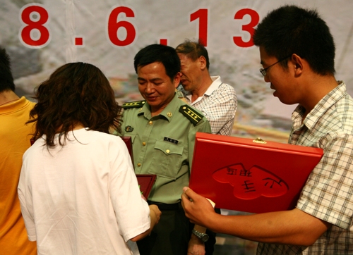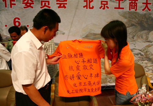 6月13日,抗震救災英模的事跡感動了每一位工商學子。學校四川籍學生、學生黨員、學生奧運志愿者和學校學生記者團自發地向6位英模贈送了最簡樸又最能表達他們心意的紀念品:學生親手折的“千紙鶴”,是帶給家鄉人民最真摯的祝福;印有“好運北京”的奧運志愿者套服,那是去年"好運北京"測試賽后志愿者保存的最珍貴留念;在工科實踐中心車間親手制作的人造水晶石深深刻上“向英模致敬”的心聲;連夜趕制的“北京工商大學記者團榮譽記者證”由學生記者代表親手掛在了張泉靈的胸前;將英雄們的手印制成手模紀念珍藏,為了告訴所有的人們:我們青年大學生與抗震救災英模心連心,手握手......英模們的英雄事跡會永遠留在學子心中。