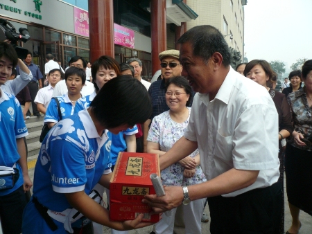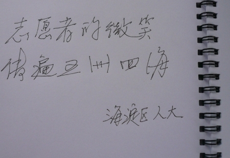 珠峰火炬?zhèn)鬟f登山隊(duì)隊(duì)長王勇峰是第一名趕到服務(wù)站的志愿者。在其他志愿者的邀請(qǐng)下,他拿起筆在一張卡片上寫下了祝福的話語:“祝福北京奧運(yùn)成功。”并把這張卡片貼到了留言板上。隨后,其他幾名登山隊(duì)隊(duì)員也相繼趕到。幾名來自北京工商大學(xué)的奧運(yùn)志愿者爭相與他們合影留念。