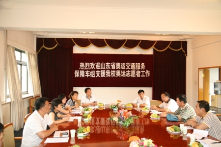 7月18日下午,我校在綜合樓三樓東會議室與山東奧運交通保障車組的領導進行座談,商討賽時用車保障的詳細事宜。后勤處副處長魏兵、學校運輸中心主任么品強、團委書記呂素香、副書記文四英、陶偉、保衛處李文啟以及山東交通集團公司的領導參加了會議。
