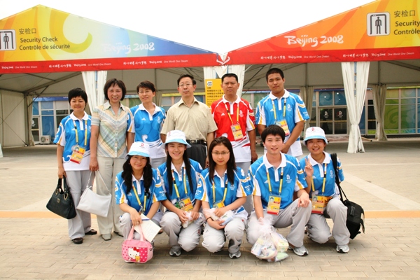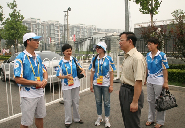 隨后,孫寶國一行依次來到奧運村的三號門、四號門和一號門看望正在烈日下工作的志愿者們。當聽說志愿者們每天必須在太陽下工作8個小時左右,而這其中有半數以上是女生,孫寶國特別強調要志愿者注意保持身體健康,保障基本的飲水和休息,還特別叮囑志愿者要服用鹽水,最好不要使用藥物。在三號門,孫寶國了解到帶隊老師楊帥能夠在完成自身工作之余,與志愿者們一同在烈日下站崗,表示了由衷的贊賞。他還詢問了志愿者工作中存在的問題,并跟志愿者們說要向一起工作的交警們學習。在歡迎中心和訪客中心,志愿者們邀請孫寶國一行與大家合影留念,在了解到這些志愿者主要任務是語言服務后,他表示這是一個鍛煉自己溝通能力的好機會,希望大家能夠借此機會多向他人學習。