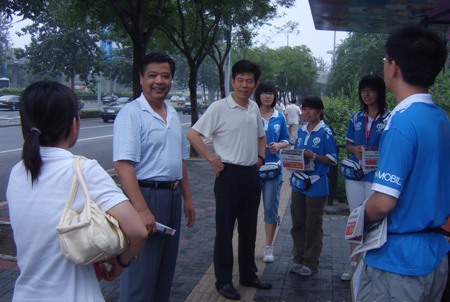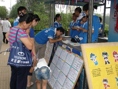中央電視塔東倚玉淵潭,南靠北京西站,北望頤和園,是奧運期間重要的旅游景點和交通樞紐,這里人流量大,對崗位設在這里的化工學院城市志愿者的工作是一個較大的挑戰。城市志愿者一個很重要的工作內容就是道路的指引,央視塔站點不時會遇到從外地來詢問路線的游客,“去玉淵潭西門怎么走?”“去鳥巢怎么坐車最方便?”“奧運專線都經過哪里?”……志愿者們總是面帶微笑、不厭其煩地為他們講解、指路。為了方便路人,他們利用休息時間制作了奧運交通手冊、奧運場館指南、公交路線展板和央視塔周邊景點介紹展板。此外,志愿者們還想出了一個“便簽”服務的新點子。他們把路線詳細地寫在便簽上遞到問路人手里,極大的方便了行人。