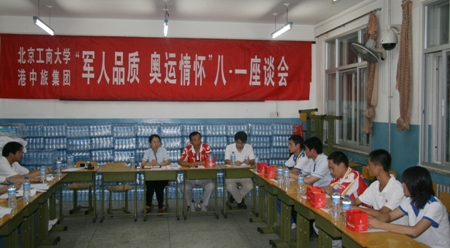 7月31日晚,北京工商大學和港中旅集團在駐地會議室共同舉行了“軍人品質、奧運情懷”慶八﹒一座談會。出席會議的有北京工商大學住宿服務團隊領隊、武裝部部長董竹娟老師,港中旅集團住宿服務團隊執行副總經理溫平,退伍復學服務生李強、趙蘭艷以及北京工商大學奧運服務團隊所有帶隊老師。
