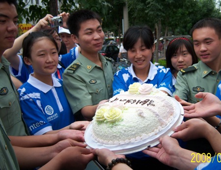 在此次活動中,戰(zhàn)士們在建軍節(jié)這一特殊的日子向行人宣傳文明交通,倡導(dǎo)文明出行,同時也得到了市民對軍人的節(jié)日祝福。在志愿者的帶動下,戰(zhàn)士們與市民共同折疊紙鶴,寄托著對奧運的美好祝福。戰(zhàn)士們也意外的收到了志愿者們贈送的節(jié)日禮物——蛋糕,他們一同唱起《生日快樂》歌,共同慶祝建軍81周年。