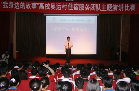 演講主題主要圍繞奧運村住宿服務(wù)工作而展開。比賽共有21支代表隊參加。我校張國梁同學(xué)以《承諾于心 行動證明》破題,開始了精彩的演講。他代表全體名奧運村住宿服務(wù)生表達了對五千年祖國和億萬華夏兒女對百年奧運夢圓的歡心,宣示出大家對這份平凡工作的獨特領(lǐng)悟。從演講中,全場觀眾被我校先進服務(wù)生不因失去親人而離崗,不因身體被利器割損而喊疼,不因工作任務(wù)繁重而退縮的先進事跡所感動,整個演講過程數(shù)次被熱烈的掌聲所打斷。