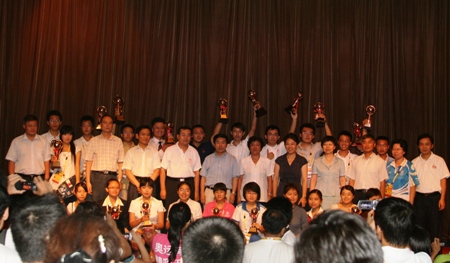 隨后,兄弟院校選送的選手陸續(xù)登臺演講。大家各有千秋,從不同角度,用不同的方式闡釋了對奧運的理解,表達了奉獻奧運的決心。經(jīng)過三組角逐,最后北京師范大學(xué)選手憑借專業(yè)而豐富的表現(xiàn)手法問鼎冠軍,我校張國梁同學(xué)榮獲“優(yōu)秀獎”。市教委孫善學(xué)委員,我校黨委書記盧思鋒等領(lǐng)導(dǎo)上臺給選手們頒獎,并合影留念。