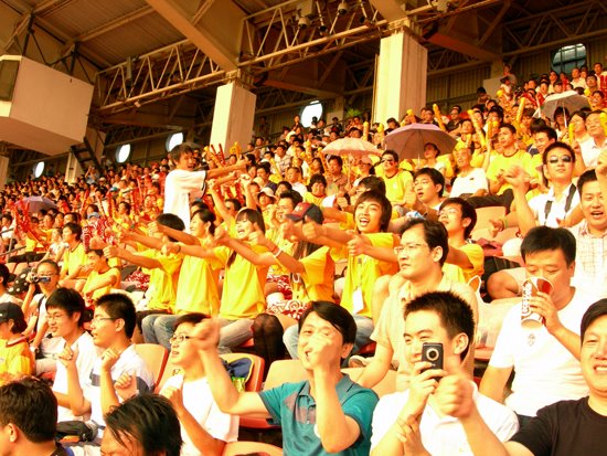 由于場(chǎng)內(nèi)高溫悶熱,比賽開始前,觀眾已汗流浹背,看臺(tái)上的觀眾服務(wù)志愿者幾次帶動(dòng)觀眾做人浪,效果都不理想。我校看臺(tái)互動(dòng)志愿者組成若干小方陣分布在看臺(tái)上,他們用夸張的肢體展示進(jìn)行人浪表演,吸引了周圍看臺(tái)上的觀眾,隨即拉拉隊(duì)特有的賽場(chǎng)氛圍撲面而來(lái),高亢、熱情的助威吶喊響徹全場(chǎng),高漲沸騰的人浪翻滾而來(lái),掀起了一陣又一陣的助威高潮。