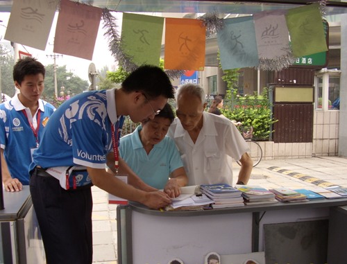 8月13日是材料系城市志愿者上崗第二天。熱情的志愿者在給市民提供多種信息咨詢服務的同時,特色活動辦得也有聲有色。為了宣傳奧運知識,永定路站點的志愿者們專門舉辦了奧運燈謎活動,活動中所有謎底都是由第29屆北京奧林匹克運動會體育項目組成。