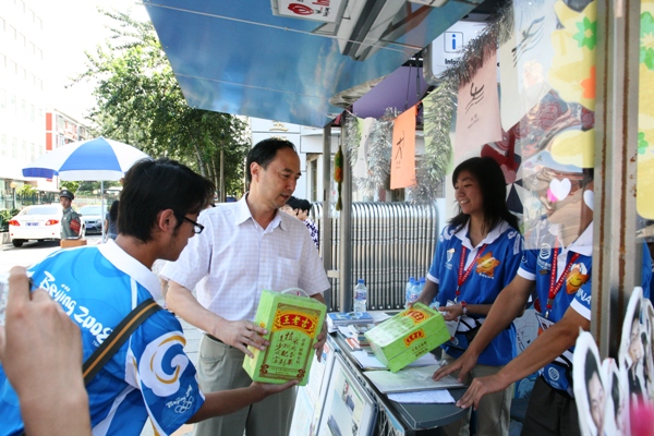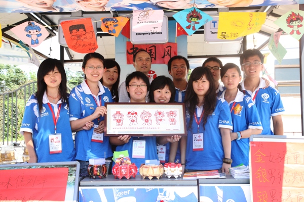 在石景山游樂園服務站點,嘉華學院的志愿者將自己親手制作的剪紙福娃作為禮物送給了盧書記;在雕塑園服務站點,嘉華學院的志愿者還將印有“嘉華學院志愿者”字樣的胸章給各位老師戴在了胸前。