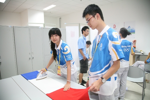 頒獎儀式通用志愿者在頒獎儀式等候區有條不紊地熨燙各國家國旗。據該業務口王璇介紹,此次他們所準備的十三面國旗正是為了今天下午四點半的男子團體競速賽。之前國旗是被整齊疊放在袋子中的,所以會有明顯折痕,他們要把每個折痕一點一點地熨燙平整。熨燙平整后,要把每面國旗穿上旗桿并反復核對上下及正反面后放到大架子上,到賽會結束后要嚴格保證這十三面國旗不被弄濕、弄褶。