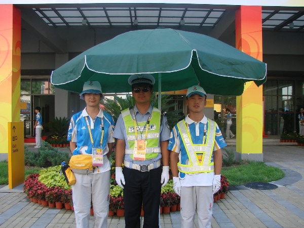 在所有業務口中,交通業務口志愿者服務的環境是比較艱苦的。每天最早來到場館的志愿者是他們,最晚離開場館的志愿者也是他們。在戶外工作難免會遇到惡劣天氣,但是盡管現在烈日炎炎,在遮陽傘下,我們看到的依然是三張熱情的笑臉。也許這就是志愿者最可愛的地方吧,也許沒有空調,但是他們有微笑;也許看不到比賽,但是通過他們的服務他們能讓比賽進行得更順利。