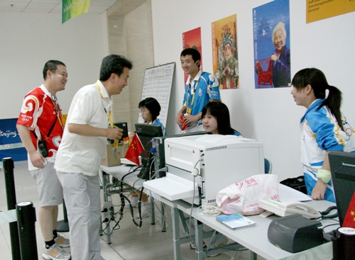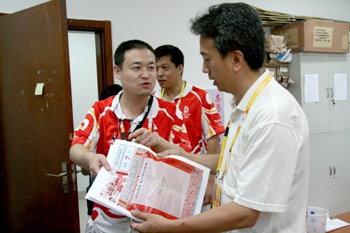 在老山自行車館志愿者簽到處李部長親切慰問志愿者,在得知簽到處的志愿者是所有志愿者中最早上崗,最晚下崗的志愿者時,他親切地對志愿者說:“辛苦啦!”他們還走訪了志愿者服務(wù)處,看望了在志愿者服務(wù)處工作的志愿者。當(dāng)他們看到志愿者團隊宣傳組辛苦工作的成果《第29屆奧林匹克運動會——老山自行車場館群志愿者快報》時,表現(xiàn)出極大興趣。他們來到志愿者團隊運行組工作處,志愿者服務(wù)經(jīng)理呂良介紹到志愿者團隊通過早晚例會了解各業(yè)務(wù)口志愿者的動態(tài),通過巡查慰問以及志愿者之星的評比等激勵措施激勵志愿者后。李部長細心查看了老山自行車場館群志愿者信息統(tǒng)計表,他強調(diào)對志愿者反映的情況、提出的問題一定要及時反饋解決。